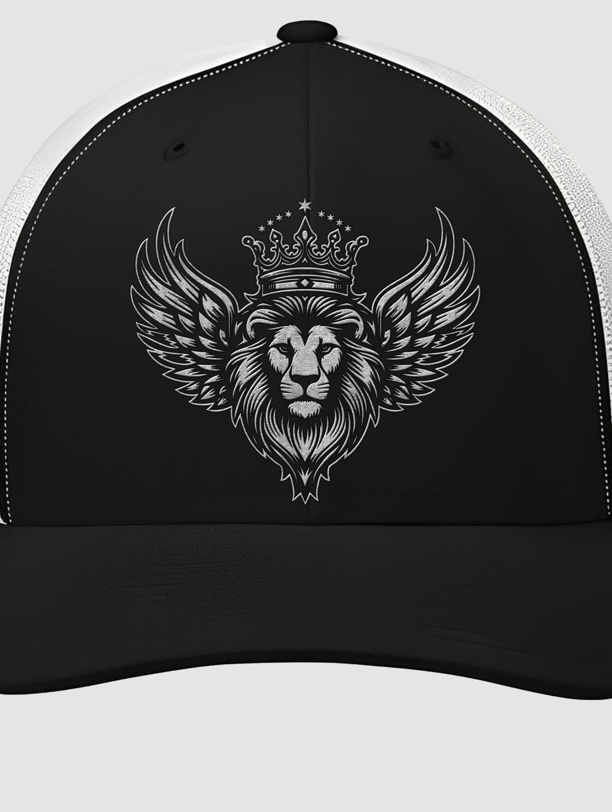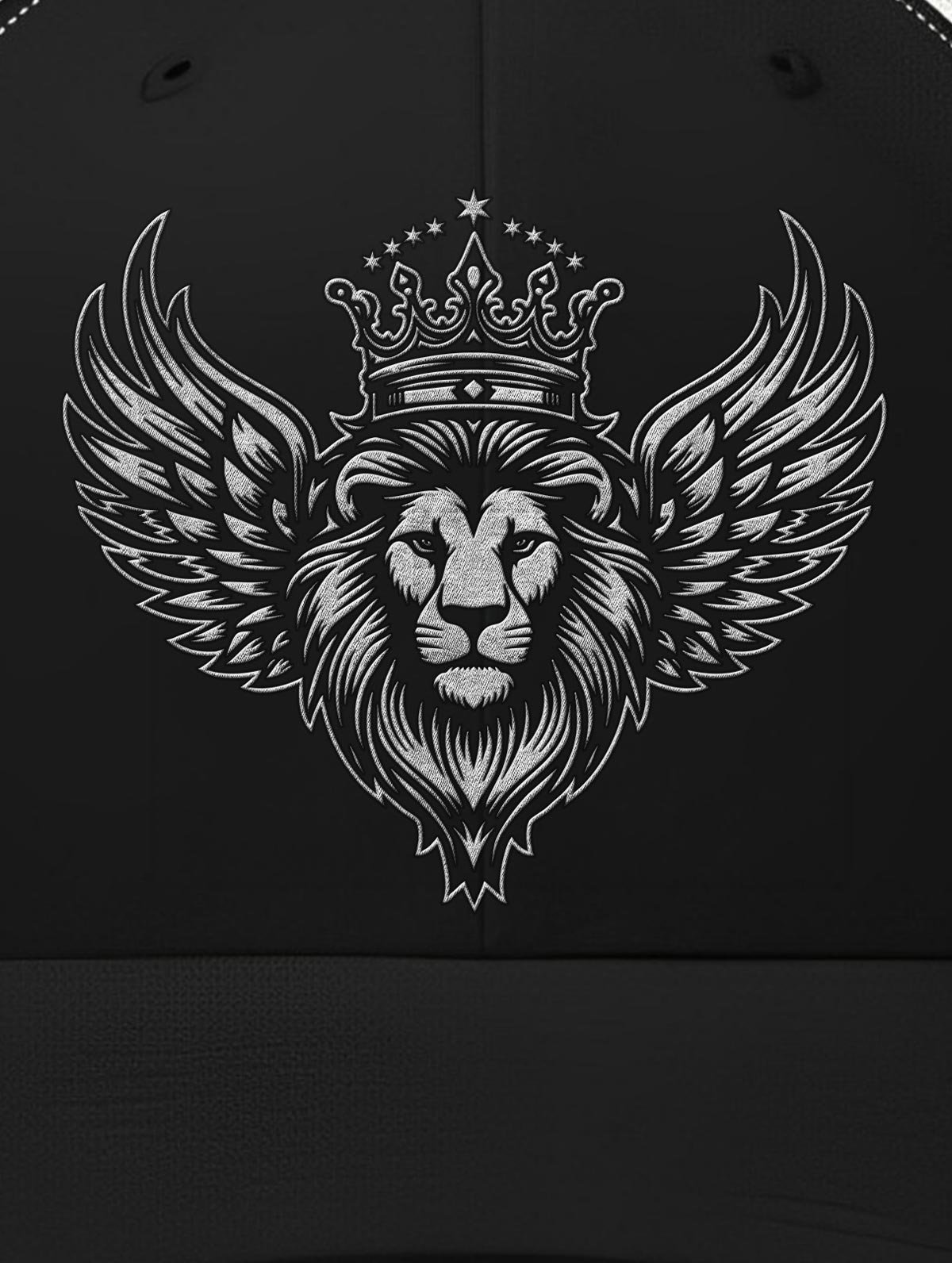 A bold statement piece featuring a majestic lion crowned with wings, designed on a sleek black and white trucker cap.