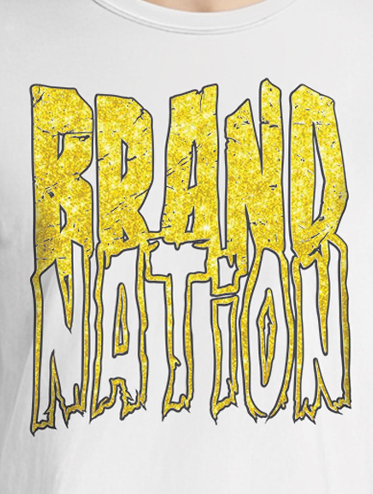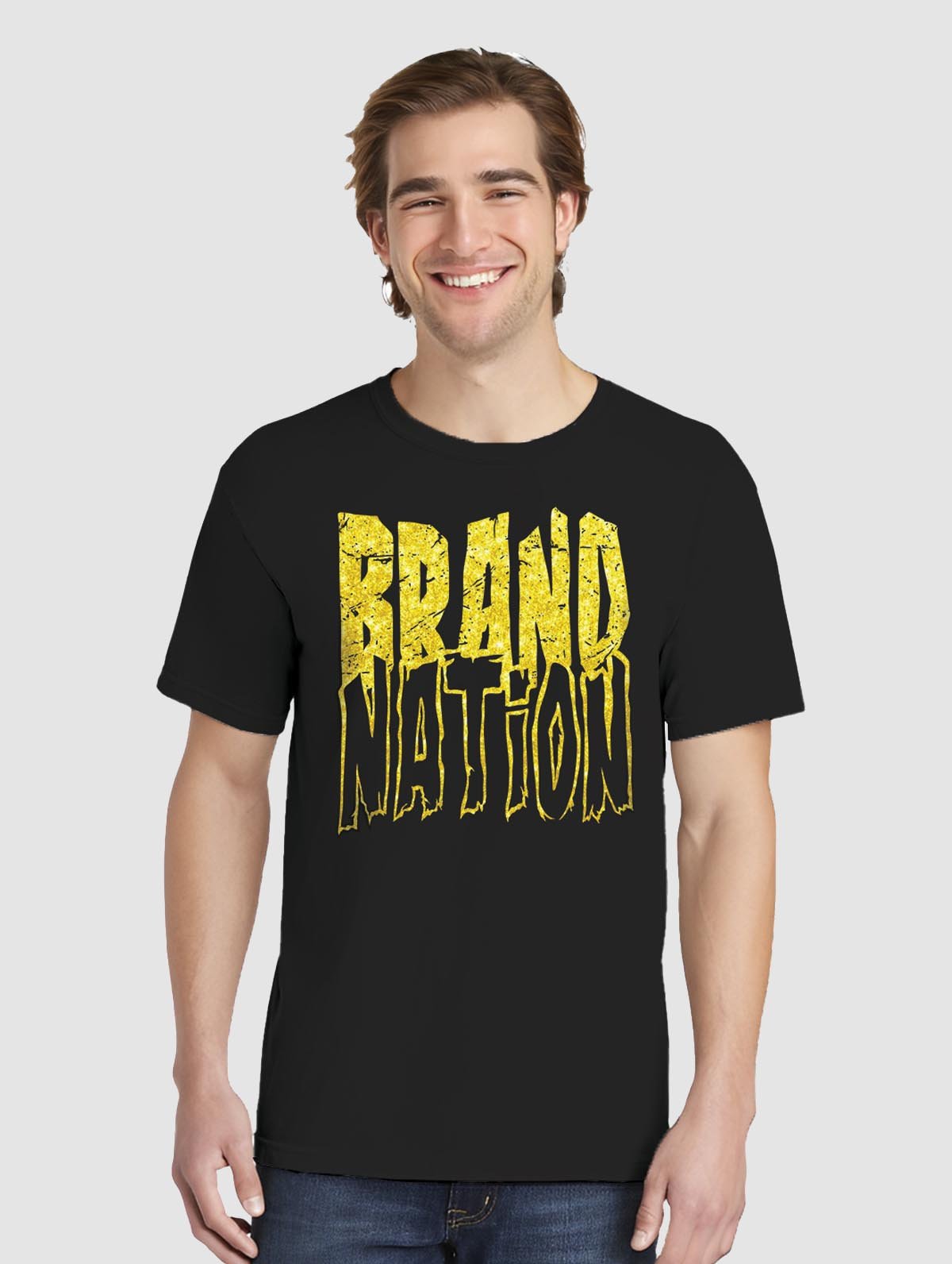 Unleash your style with this versatile “Brand Nation” t-shirt, available in both classic black and crisp white. The wood-style print, accentuated with an eye-catching gold foil finish, adds a touch of sophistication to your casual wardrobe. Crafted from premium fabric, this tee ensures long-lasting comfort and durability. Whether you’re dressing up or keeping it casual, this t-shirt is the perfect choice for making a bold fashion statement.