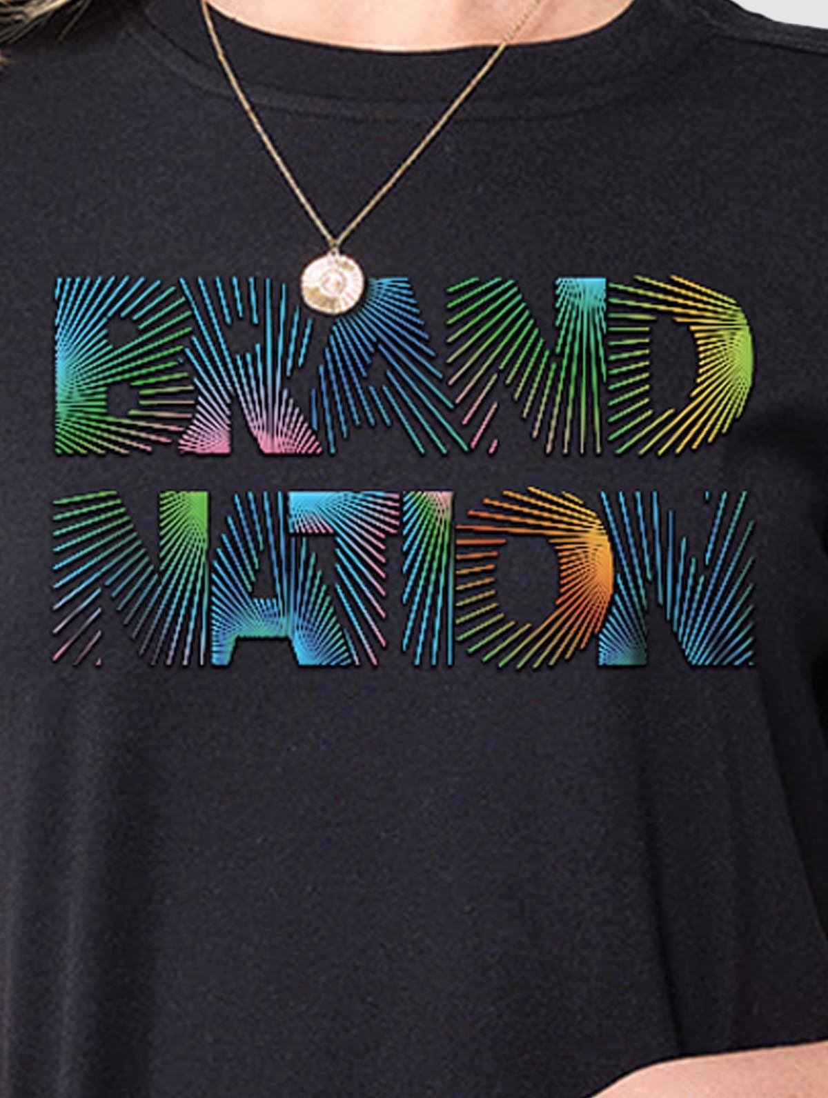 Step up your casual style with this sleek black graphic tee featuring a colorful “Brand Nation” design. A versatile choice that keeps you comfortable and trendy for any laid-back occasion.