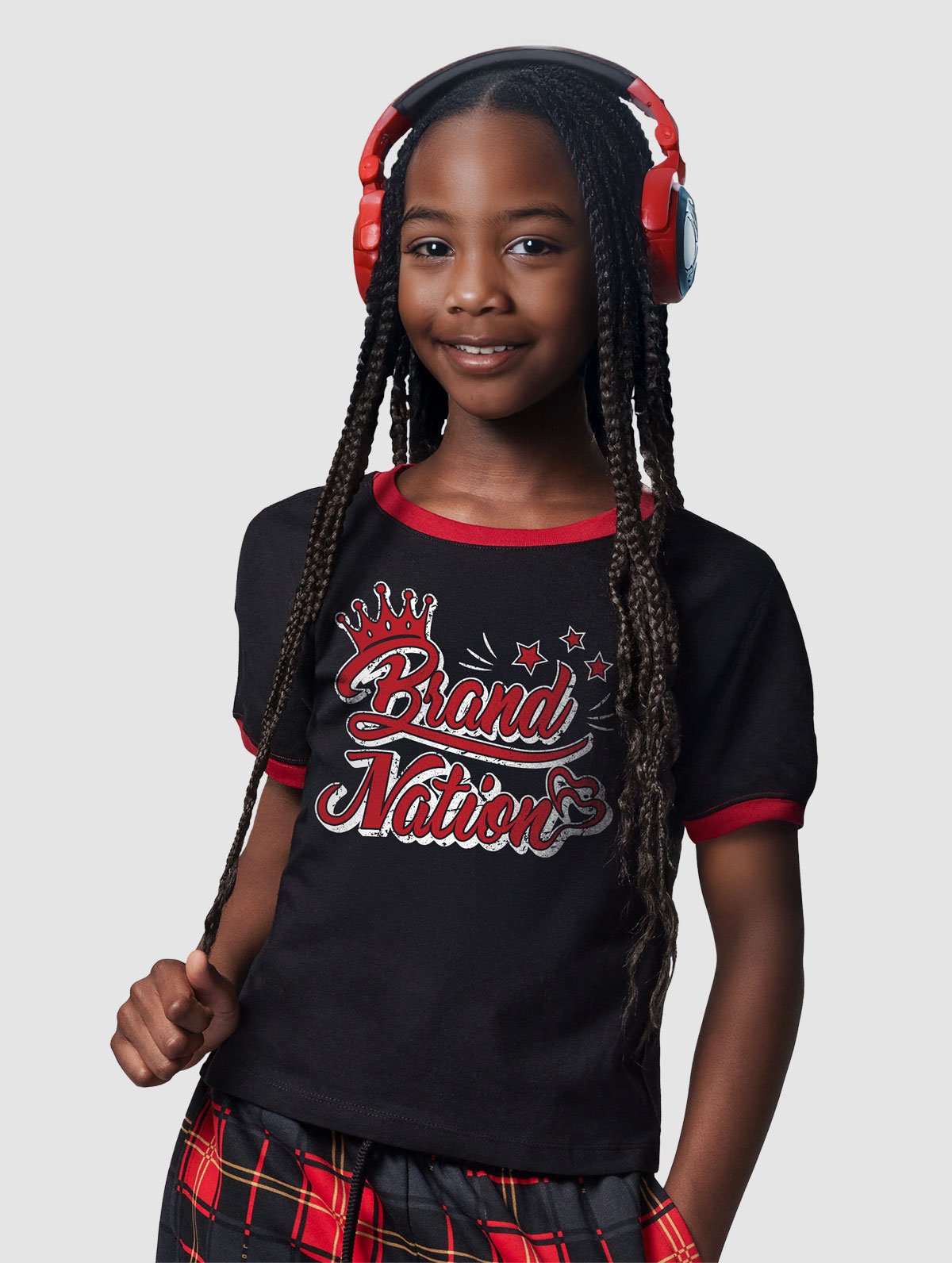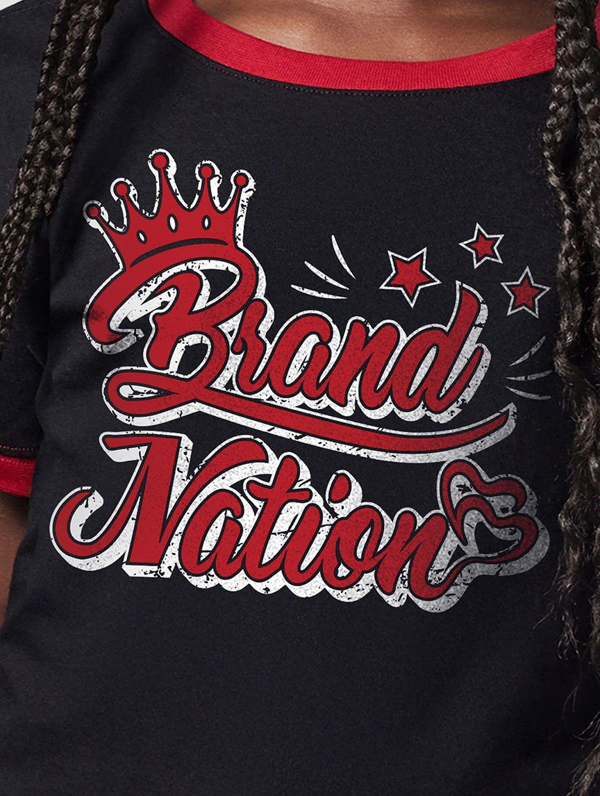 Let your little one shine like royalty with the Girls’ Royal Crown Glitter T-Shirt. Designed with sparkling “Brand Nation” lettering and a bold crown motif, this T-shirt adds a touch of glam to any outfit. Made from soft, breathable fabric, it ensures both comfort and durability for all-day wear. The black base with contrasting red trims makes it versatile yet trendy, while the glitter design adds just the right amount of sparkle for standout style. Whether paired with jeans, a skirt, or plaid pants, this T-shirt is sure to make her feel like a star!